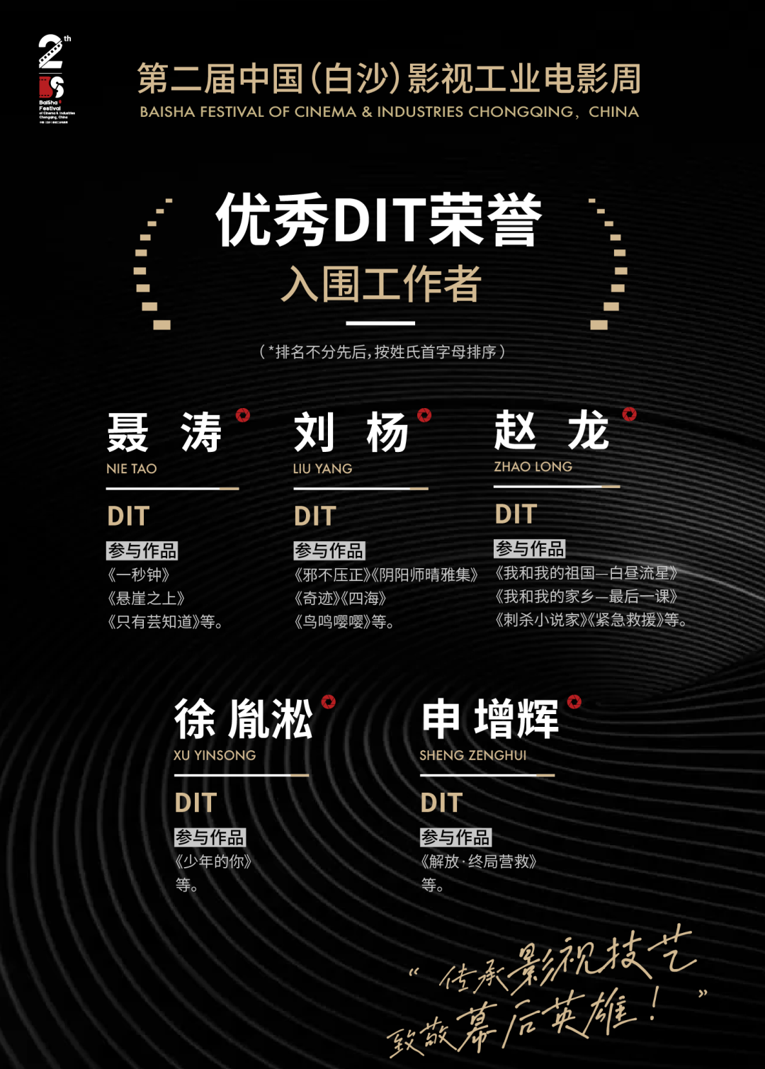第二届中国(白沙)影视工业电影周优秀DIT荣誉入围工作者:聂涛,参与作品《一秒钟》、《悬崖之上》、《只有芸知道》等等;刘杨,参与的作品有《邪不压正》、《阴阳师晴雅集》、《奇迹》、《四海》、《鸟鸣嘤嘤》等等;赵龙,参与的作品有《我和我的祖国一白昼流星》、《我和我的家乡一最后一课》、《刺杀小说家》、《紧急救援》等等;徐胤淞,参与的作品有《少年的你》等等。申增辉,参与的作品有《解放·终局营救》等等。